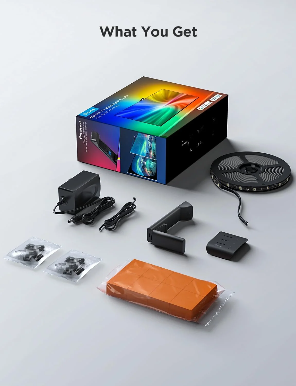 نور پس زمینه تلویزیون Govee TV Backlight 3 Lite با عملکرد اصلاح چشم ماهی، همگام سازی با تلویزیون های 75-85 اینچی، نور پس زمینه LED RGBICW Wi-Fi TV با دوربین، 4 رنگ در 1 مهره لامپ، کنترل صدا و برنامه، آداپتور
