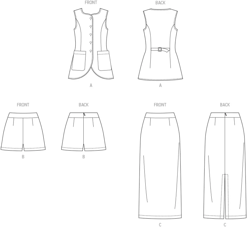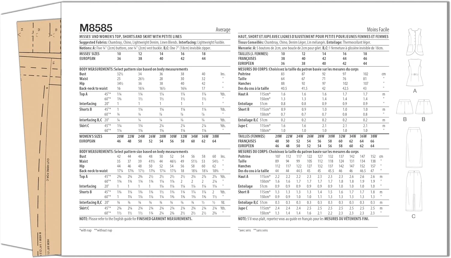 تاپ فیت با جیب های وصله ای جلو و کمربند پشتی با سگک جلیقه؛ شورت و دامن فیت دارای زیپ نامرئی در پشت هستند. پیشنهادات پارچه: چمبری، چینو، جین سبک وزن، ترکیبات کتان؛ لایی: لایی چسب سبک وزن. کیت های الگوی مک کالز دارای قطعات الگو برای برش پارچه، دستورالعمل های گام به گام نوشته شده و مصور برای راهنمایی شما در فرآیند خیاطی، اطلاعاتی در مورد نحوه انتخاب پارچه و تزئینات و اطلاعات مربوط به اندازه هستند. این الگوهای خیاطی لباس را می توان برای سایزهای زنانه 10-12-14-16-18 تهیه کرد. کد طراحی M8585. الگوهای خیاطی مک کالز با افتخار در ایالات متحده طراحی و ساخته می شوند.
