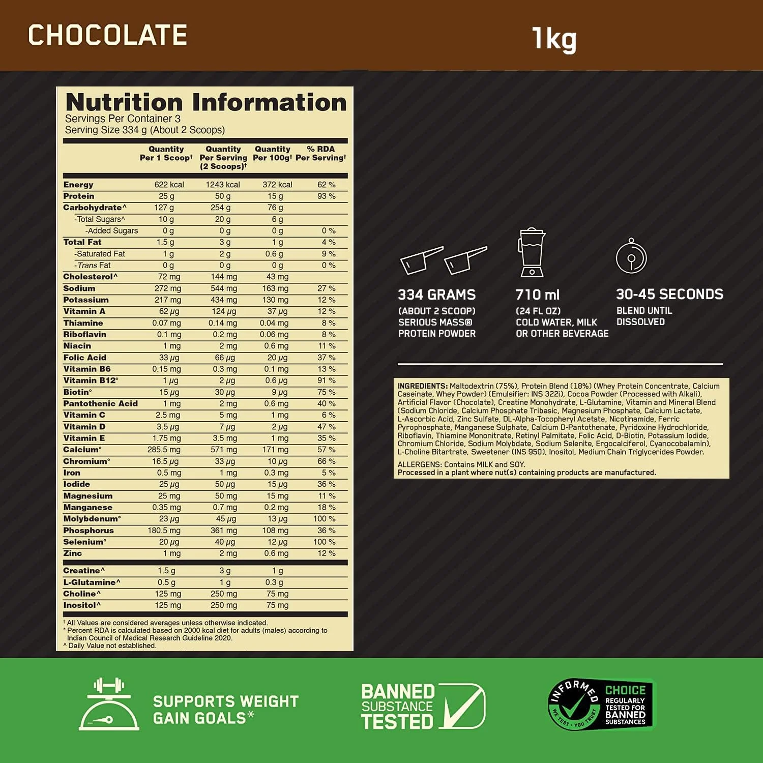 پودر افزایش وزن و حجم پروتئین بالا و کالری بالا اپتیموم نوتریشن (ON) سریوس مس - 1 کیلوگرم (شکلاتی) به همراه ویتامین ها و مواد معدنی، مناسب برای گیاهخواران